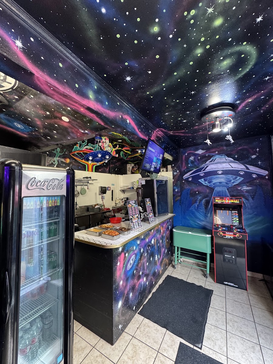 i love this place, super tiny and easy to miss but when you go inside it's an amazing atmosphere, it's quite literally like being in a whole other world. there's murals everywhere and alien themed merchandise and signs and posters, there's a terminator arcade machine, it's just sick and they put a lot of effort in. the owners and employees are super nice and chatty and they have great customer service. obviously what's also important is the food, and they do a good job there first and foremost. the menu isn't overcrowded or complicated and you can make your own pizza cones and your own UFOs. the food is warm, made with loveand overall just comforting. it's not super fancy it's just really solid and it does what it needs to, while also being fun to eat and look at it (I mean seriously it's pizza in a cone and a burger shaped like a flying saucer what's not to love). this is a fun place that's great for kids as well, with all the hallmarks of a good respectable family owned restaurant, and it's also in an awesome area. solid place for anyone anytime